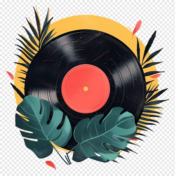 Immerse yourself in retro vibes with this stunning free Tropical Vinyl Record PNG. Featuring a classic black vinyl disc with a vibrant red center, elegantly framed by lush dark green Monstera leaves and striking yellow tropical fronds, this illustration is perfect for adding a cool, vintage-tropical touch to your designs. Ideal for music-themed projects, summer event promotions, album art, social media graphics, or personal creative ventures. Download this high-quality, transparent PNG for free and infuse your work with a unique blend of music nostalgia and exotic beauty. Perfect for web design, print, and digital art. Get your free download now!