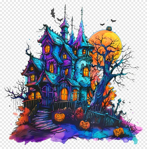 Tags: Halloween bare tree bats colorful dark digital art fantasy free download full moon glowing haunted house illustration jack-o'-lanterns mansion mystical night png spooky vibrant watercolor