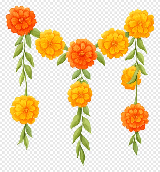 Tags: Diwali Indian festival Marigold botanical celebration ethnic festive floral decoration free download green leaves marigold garland orange flowers pooja religious traditional transparent PNG vibrant watercolor flowers wedding decor yellow flowers