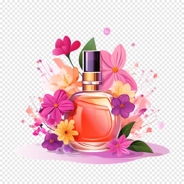 Tags: aesthetic beauty bloom cosmetics elegant fashion floral flowers fragrance gold accents illustration luxury orange liquid perfume bottle pink flowers purple flowers scent transparent PNG vibrant watercolor