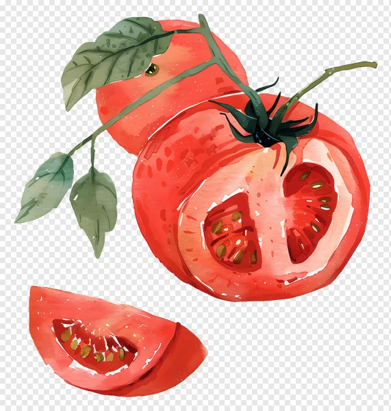 Download this stunning, high-quality watercolor tomato PNG for free! Featuring a beautifully illustrated whole tomato on the vine with green leaves, a detailed half-sliced tomato revealing its juicy seeds, and a fresh tomato wedge, all rendered with artistic watercolor texture and a transparent background. Perfect for food blogs, recipe cards, restaurant menus, cooking websites, healthy eating promotions, or any design project needing vibrant, fresh vegetable illustrations. Enhance your designs with this artistic and delicious tomato graphic today!