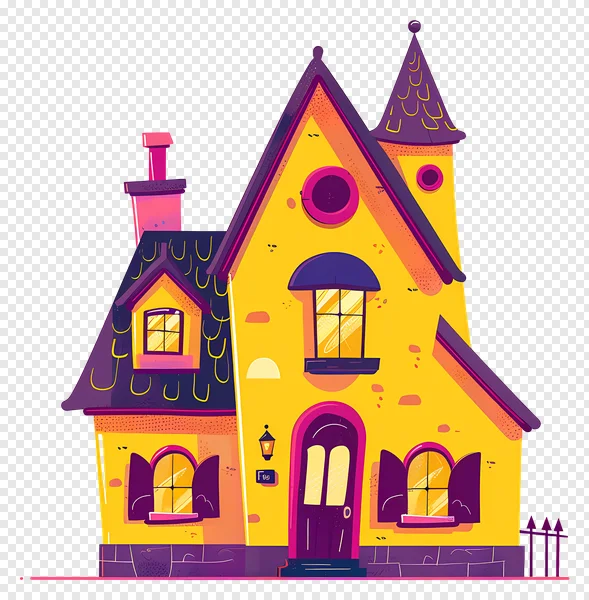 Download this captivating whimsical cartoon house PNG for your next creative project! Featuring vibrant yellow walls, a charming purple roof, and playful details like dormer windows, a crooked chimney, and a welcoming dark door, this high-quality illustration adds a touch of magic to any design. Ideal for children's books, Halloween themes, fantasy designs, digital scrapbooking, or unique invitations. Get this free transparent background image today to elevate your designs with a splash of color and enchantment!