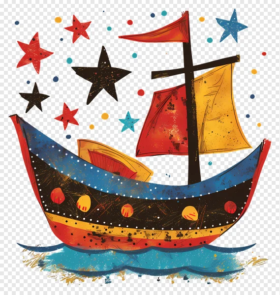 Download our free, vibrant PNG of a whimsical boat illustration sailing under a star-filled night sky. This colorful cartoon ship, featuring textured red and yellow sails and a multi-striped hull, navigates deep blue waves. Adorned with twinkling stars and small planets, this artistic, hand-drawn style image is perfect for children's book illustrations, educational content, graphic design projects, or adding a playful, adventurous touch to any creative work. Enhance your designs with this high-quality, transparent background image today!
