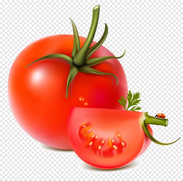 Download this high-quality, free PNG image featuring a vibrant, ripe red whole tomato alongside a freshly sliced quarter, complete with visible seeds. Enhancing the natural charm are a delicate sprig of green parsley, sparkling water droplets, and a tiny red ladybug resting on the stem. Perfect for food blogs, recipe websites, restaurant menus, grocery ads, healthy eating campaigns, or any design project needing fresh produce visuals with a transparent background. Get this detailed vector illustration for your culinary and nature-themed designs today!