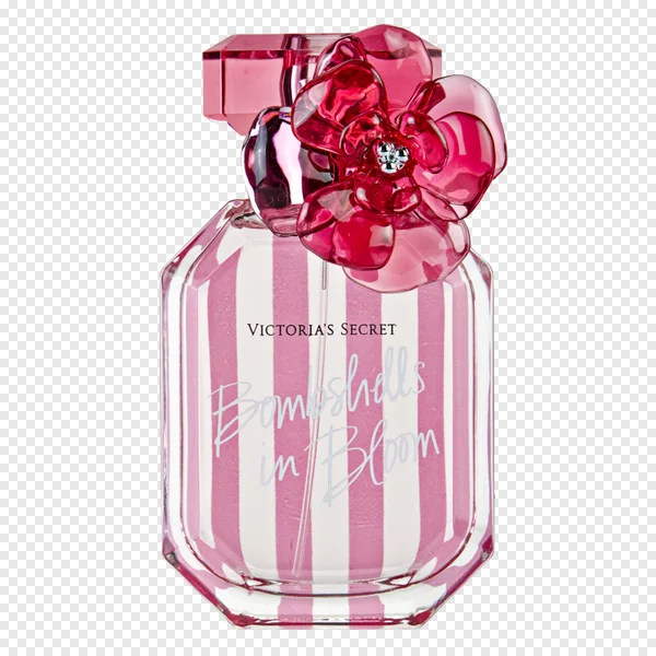 Download this stunning free PNG of Victoria's Secret Bombshells in Bloom perfume bottle. Featuring iconic pink and white stripes, a clear glass design, and a vibrant pink floral cap with a sparkly embellishment, this high-quality image is perfect for your design projects. Ideal for beauty blogs, fashion websites, marketing materials, or personal creative endeavors. Get this elegant and luxurious fragrance bottle with a transparent background for immediate use in your next graphic design. Enhance your visuals with this beautiful and feminine perfume shot today!