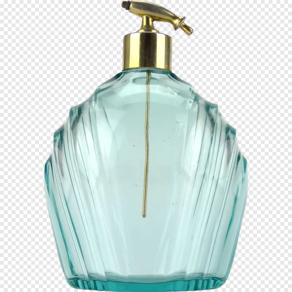 Discover this stunning vintage aqua glass perfume atomizer bottle, perfect for adding a touch of elegance to your designs. Featuring a beautiful ribbed, shell-like glass design and a classic golden brass pump, this Art Deco inspired fragrance spray bottle is ideal for beauty blogs, nostalgic graphics, or decorative projects. Download this high-quality, transparent PNG image for free today and enhance your creative work with its unique charm and sophisticated appeal. Perfect for personal or commercial use!