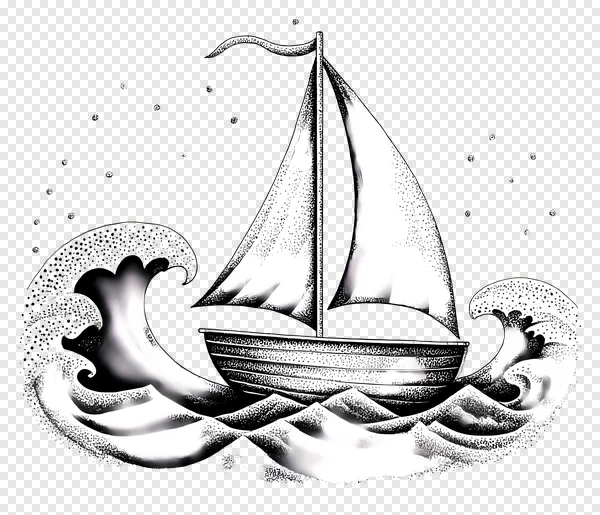 Download this captivating black and white sailboat PNG for free! This unique illustration features a classic sailing boat navigating a turbulent, powerful sea with cresting waves. The vintage stipple art technique gives it a distinct, textured, and high-contrast look, perfect for adding a touch of maritime adventure or old-school charm to your creative projects. Ideal for T-shirts, website banners, blog graphics, historical designs, or any visual content needing a striking nautical theme. Get your transparent, high-quality PNG download now and set sail on your next design journey with this timeless piece!
