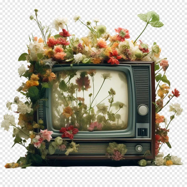 Step into a whimsical world with our free Vintage Floral TV PNG. This captivating image features a classic retro television set, beautifully overgrown with a lush array of vibrant flowers and delicate foliage in shades of white, cream, red, orange, and green. The screen itself displays an ethereal botanical scene, blending nature's beauty with nostalgic technology. Perfect for graphic design projects, digital art, social media posts, vintage-themed crafts, or adding a unique, organic touch to any creative endeavor. Download this high-quality, transparent background PNG for free and bring a touch of natural elegance and retro charm to your work today!