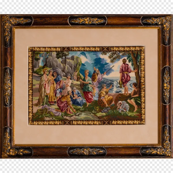 Discover a stunning vintage needlepoint tapestry, intricately crafted to depict a classical or biblical scene. This free PNG features a group of ancient figures gathered by water, with a central figure holding a staff, all beautifully framed in an ornate dark wood and gold frame. Ideal for historical presentations, cultural projects, digital scrapbooking, or adding an antique touch to your designs. Download this high-quality, detailed textile art image for free and explore its rich textures and compelling narrative. Perfect for art enthusiasts, educators, and designers seeking unique, high-resolution imagery.