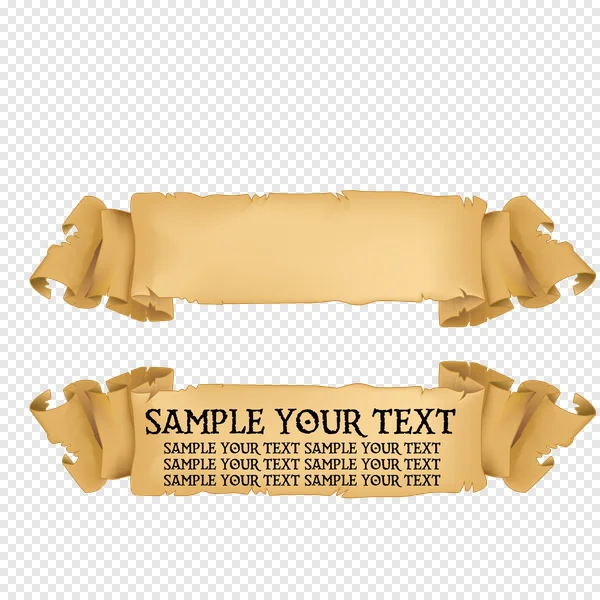 Download these exquisite vintage parchment scroll banners for free! This high-quality PNG image features two beautifully aged, weathered paper ribbons with rugged, torn edges and a transparent background. Perfect for adding a touch of antique charm to your projects, whether for customizable text, medieval-themed designs, pirate maps, invitations, certificates, website graphics, presentation slides, or scrapbooking. The set includes a blank scroll and one with "SAMPLE YOUR TEXT" as a placeholder, offering versatile design possibilities. Enhance your creative works instantly with these rustic and decorative design elements. Get your free graphic asset today!