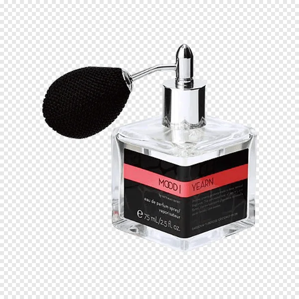 Download this exquisite PNG image of a Mood Yearn perfume bottle, featuring a classic vintage-style black atomizer pump. This elegant clear glass square bottle, labeled 'eau de parfum spray / vaporisateur e 75 mL / 2.5 fl. oz.' with a striking black and red design, is perfect for adding a touch of luxury and sophistication to any project. Ideal for beauty blogs, e-commerce product displays, graphic design, marketing materials, or creating stunning mockups. Get this high-quality, isolated fragrance bottle PNG for free and elevate your digital content.