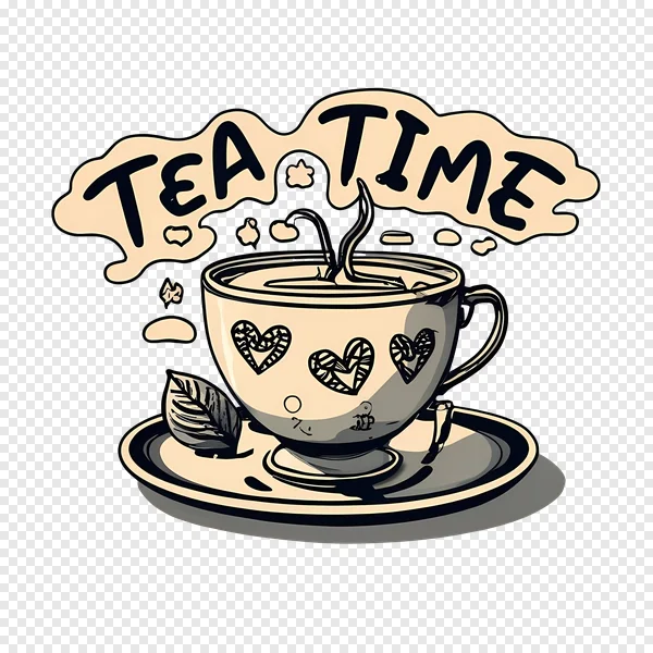 Download this beautiful vintage-style 'Tea Time' PNG image for free! Featuring a charming illustration of a teacup with heart designs, steam, and a tea leaf, it's perfect for crafting, scrapbooking, blog posts, social media graphics, or adding a cozy touch to your projects. High-resolution and transparent background for easy integration. Get your free download now and enjoy a relaxing tea time vibe!