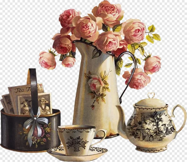Download this beautiful Vintage Tea Time Still Life PNG for free! This exquisite image features a charming bouquet of soft pink roses in a rustic pitcher, alongside an ornate teapot, a delicate teacup with saucer, and a quaint basket filled with 'Tea Time' cards. Perfect for adding a touch of elegance and nostalgia to your digital projects, scrapbooking, invitations, website banners, or social media graphics. Its transparent background makes it easy to integrate into any design. Embrace the shabby chic and cottagecore aesthetic with this high-quality floral and tea-themed graphic. Get your free download now and elevate your creative work!