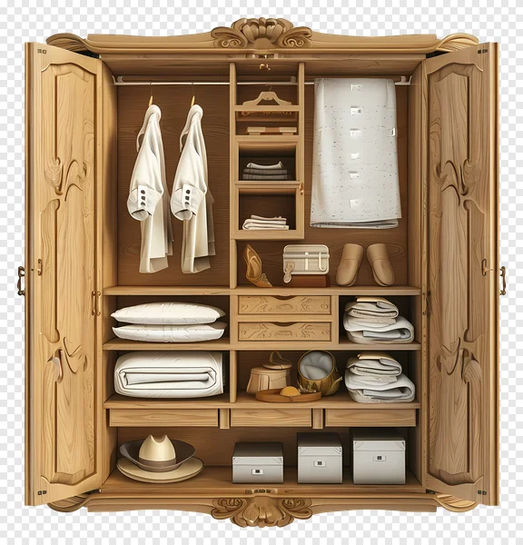 Download this stunning vintage wardrobe PNG image for free! Featuring a beautifully detailed, open wooden closet filled with neatly organized clothes, shoes, hats, and boxes. Perfect for interior design projects, mood boards, digital art, or adding a touch of classic elegance to your designs. High-resolution and transparent background for easy integration. Get your free download now!