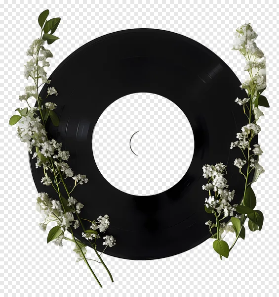 Download this beautiful, high-quality PNG image of a black vinyl record adorned with delicate white flowers. Perfect for music-themed designs, album art, blog posts, social media graphics, or any project needing a vintage and floral touch. This free PNG has a transparent background for easy integration into your work. Enhance your creative projects with this stunning visual – download now and use it freely!