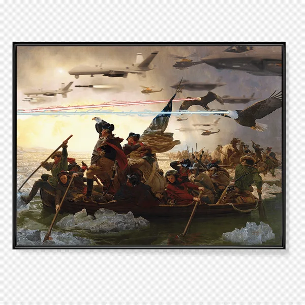 Download this unique free PNG of 'Washington Crossing the Delaware' reimagined with a thrilling modern twist! Witness George Washington and his troops navigating icy waters as stealth bombers, attack helicopters, and armed drones fill the chaotic skies. Two majestic bald eagles, one fiercely firing a powerful blue laser beam, add a patriotic yet futuristic touch to this epic historical parody. Perfect for memes, educational projects, unique graphic designs, or a standout desktop background. Get your high-resolution transparent PNG today and blend history with contemporary action!