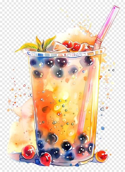 Download this beautiful watercolor-style bubble tea PNG image for free! Perfect for graphic design projects, social media posts, website backgrounds, or adding a refreshing touch to your digital art. This high-quality PNG features a vibrant boba tea with fruit, bubbles, and a splash effect, all rendered in a stunning watercolor aesthetic. Enhance your designs with this free, transparent background image today!