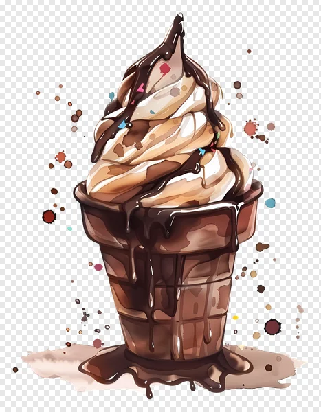 Indulge your senses with this delightful free PNG image of a chocolate-drizzled soft serve ice cream cone! Featuring rich brown and cream swirls of ice cream, a classic waffle cone, vibrant colorful sprinkles, and luscious chocolate syrup dripping down, all rendered in a charming watercolor style against a striking black background with artistic splatters. Perfect for adding a sweet touch to your menus, social media posts, website banners, food blogs, or any graphic design project. Download this high-quality, transparent PNG for free and instantly elevate your creative content with this mouth-watering dessert illustration. A perfect visual treat for summer campaigns, event promotions, or delightful digital art. Get yours now!