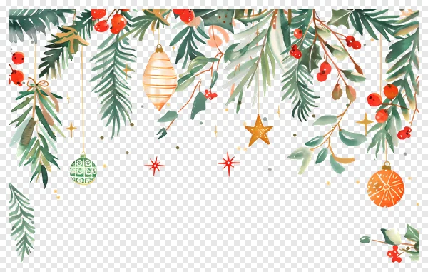 Download this beautiful watercolor Christmas decoration PNG for free! Featuring a delicate garland of evergreen branches, sparkling ornaments, mistletoe, and festive stars, this image is perfect for holiday cards, website graphics, scrapbooking, and more. Enhance your Christmas projects with this high-quality, transparent background PNG. Instantly add a touch of winter magic to your designs – download now!
