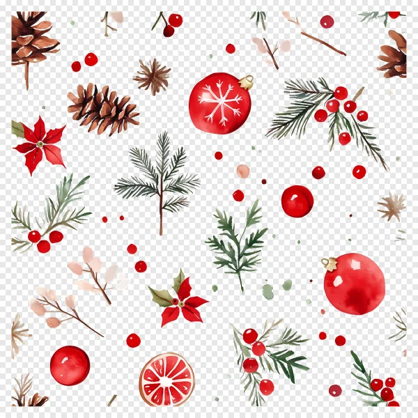 Download this beautiful watercolor Christmas elements PNG for free! Featuring festive foliage like pine branches, poinsettias, berries, pinecones, and ornaments, this transparent background image is perfect for holiday cards, scrapbooking, graphic design, and DIY projects. Add a touch of winter magic to your creations with this high-quality, free-to-use PNG. Enhance your designs with these charming Christmas illustrations!