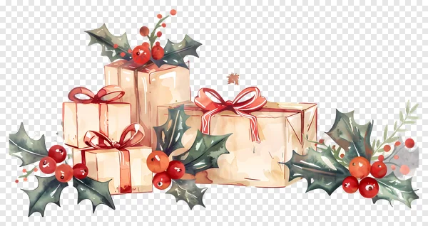 Download this beautiful watercolor illustration of Christmas gifts, holly, and berries as a free PNG! Perfect for holiday cards, gift tags, website graphics, scrapbooking, and festive designs. This high-quality image features a delicate, hand-painted style with transparent background for easy integration into your projects. Add a touch of warmth and cheer to your Christmas creations – download now and use it for free!