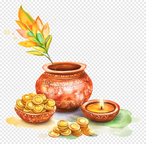 Tags: Candle Celebration Clay Pot Decoration Deepavali Diwali Diya Festival of Lights Festive Flower Gold Coins Holiday Illustration Indian Culture Indian Festival Oil Lamp PNG Traditional Transparent Background Watercolor