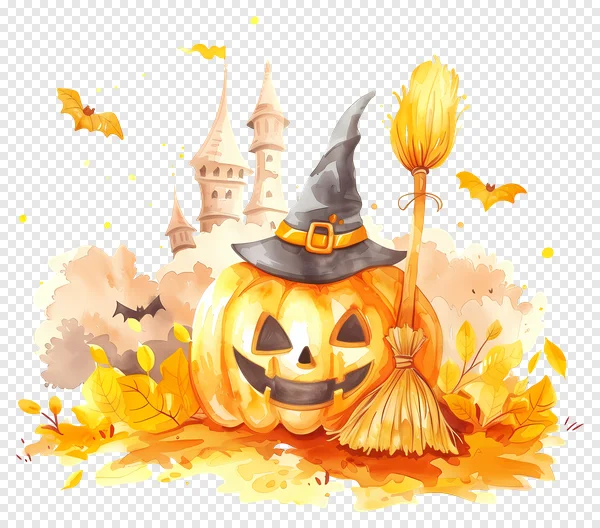 Capture the spirit of Halloween with this charming watercolor Jack-o'-Lantern PNG! Featuring a friendly pumpkin wearing a classic witch hat, accompanied by a broom, flying bats, and a mysterious castle silhouette, this illustration is perfect for all your spooky season projects. Adorned with vibrant autumn leaves, this free transparent PNG is ideal for digital scrapbooking, party invitations, social media graphics, craft designs, and seasonal decor. Instantly enhance your creative work with this high-quality, festive Halloween artwork. Download now and add a touch of magic to your designs!