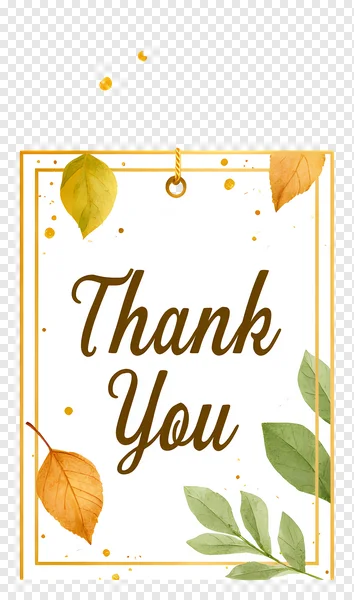 Download this beautiful free PNG featuring an elegant 'Thank You' tag designed with a charming watercolor aesthetic. The tag showcases a lovely brown script font for 'Thank You,' framed by a sophisticated double gold border. It's adorned with a mix of vibrant golden autumn leaves and fresh green foliage, along with delicate gold speckles, adding a touch of warmth and celebration. A small gold string eyelet at the top completes the tag design. Perfect for digital scrapbooking, thank you cards, gift tags, wedding stationery, appreciation notes, or any project needing a heartfelt message. Add a touch of grace to your designs, completely free!