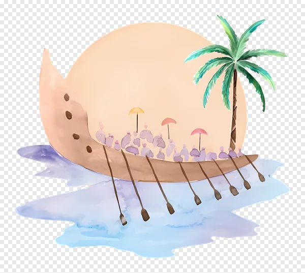 Discover this charming free watercolor PNG illustration featuring a tropical boat filled with people rowing, sheltered by colorful umbrellas, with a majestic palm tree and a soft sunset or sunrise-like orb in the background. Perfect for adding a touch of summer, teamwork, or vacation vibes to your digital projects, website graphics, invitations, or scrapbooking. This high-quality, transparent background image is ideal for designers, content creators, and anyone seeking a whimsical, sun-drenched island adventure theme. Download this beautiful clip art now to enhance your creative work!