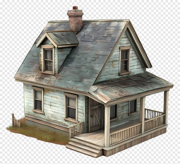Looking for a charming yet weathered old house for your next project? Download this high-quality free PNG image of a rustic, dilapidated cottage, complete with a detailed front porch, wooden steps, and a classic brick chimney. The peeling pale blue paint on the wooden siding, worn shingle roof, and dormer windows add authentic vintage character. Perfect for game developers, graphic designers, illustrators, or anyone needing a quaint, aged building asset. Enhance your digital art, presentations, or even create a spooky scene. Get this transparent background PNG now!