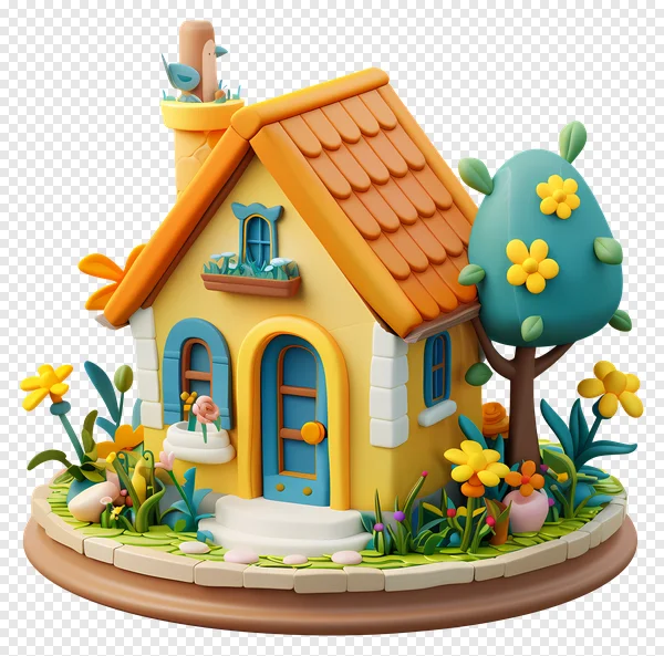 Bring a touch of magic to your designs with this charming, free 3D cartoon house PNG image. Featuring a cheerful yellow house with an orange roof, a cute blue door, and a whimsical garden brimming with vibrant flowers, a lush green tree adorned with blossoms, and adorable birds perched on the chimney. This high-quality, transparent PNG is rendered in a delightful claymation-like style, making it perfect for children's books, game design, educational materials, digital art projects, or adding a playful, idyllic element to any creative endeavor. Download now and let your imagination blossom!