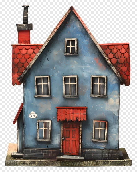 Download this charming, free PNG of a whimsical blue house, featuring a vibrant red gabled roof, a distinctive red front door, and a cozy chimney. Rendered in a unique distressed and painterly art style with visible textures and subtle paint splatters, this transparent illustration adds a touch of rustic fantasy to any project. Ideal for children's book illustrations, graphic design, digital art, creative crafts, or adding a storybook feel to your web and print designs. This high-quality image of a cozy, detailed home is ready for your next project!