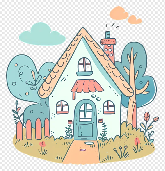 Step into a world of charm with this delightful whimsical cartoon house PNG, available for free download! This enchanting illustration features a cute, pastel-colored home with an arched door and windows, a scallop-tiled roof, and a smoking chimney, all nestled within a lush, tranquil landscape. Surrounded by stylized trees, a quaint picket fence, green grass, tiny flowers, and fluffy clouds, this image evokes a cozy, storybook feel. It's perfect for enhancing children's book illustrations, greeting cards, educational materials, website graphics, or any creative design needing a touch of warmth and imagination. Download this high-quality PNG with a transparent background to effortlessly integrate a fairytale essence into your digital and print creations today!