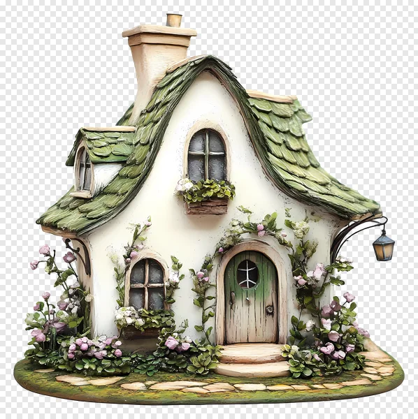 Discover this enchanting fairy tale cottage PNG, perfect for adding a touch of magic to your designs. Featuring a charming green mossy roof, pristine white walls, quaint arched windows with flower boxes, and a rustic round green door, this whimsical house is adorned with delicate pink climbing flowers and vines. A vintage lantern adds to its storybook appeal, nestled on a base of lush grass and stepping stones. Ideal for scrapbooking, digital art, invitations, children's book illustrations, or fantasy-themed projects. Download this high-quality, transparent PNG for free and bring your creative visions to life with this delightful fantasy home.
