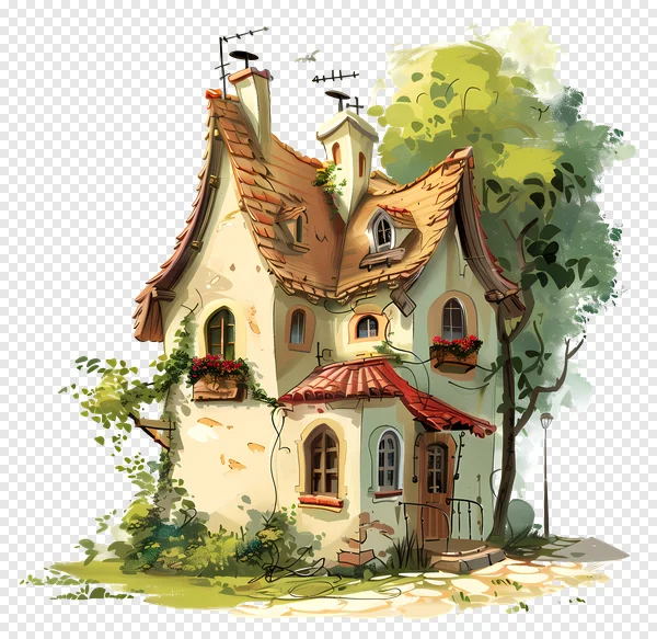Tags: European style home cartoon house PNG charming building digital art dream house enchanted dwelling fairytale cottage fantasy illustration flower boxes free download green foliage ivy magical scene old house art quaint cottage storybook architecture terracotta roof transparent background unique design whimsical house