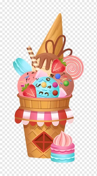 Dive into a world of sugary delight with this enchanting PNG illustration featuring a whimsical ice cream cone transformed into a fantastical dessert shop! This vibrant and detailed graphic showcases multiple scoops of delicious ice cream adorned with fresh strawberries, chocolate drizzle, colorful sprinkles, wafer sticks, and a swirl lollipop. The adorable waffle cone base, complete with a striped awning and tiny window, sits beside a cute pink and blue macaron. Perfect for adding a touch of sweetness to your design projects, websites, invitations, or digital art. Download this high-quality, transparent PNG for free and bring your creative ideas to life with this delightful fantasy dessert scene!