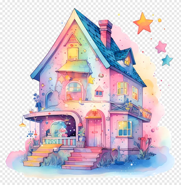 Discover this captivating free PNG of a whimsical pastel watercolor dream house. Adorned with sparkling stars, a cozy porch, and a charming balcony, this fantasy cottage illustration boasts vibrant gradient colors and a beautiful watercolor texture. Its transparent background makes it ideal for seamless integration into any design project, from digital art and scrapbooking to creating unique invitations and website graphics. Download this magical, high-quality home illustration for personal and commercial use and add a touch of dreamy charm to your creations!