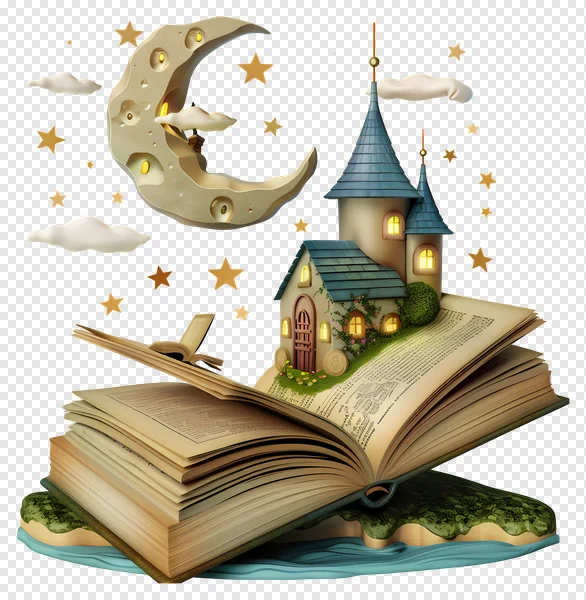 Step into a world of pure imagination with this enchanting free PNG image. Featuring a whimsical fairytale castle and a cozy house nestled on the open pages of a magical storybook, under a sky filled with a glowing crescent moon and sparkling golden stars. Perfect for children's book illustrations, digital art projects, creative presentations, or adding a touch of fantasy to any design. Download this high-quality, transparent background PNG for free and let your creativity take flight! Ideal for storytelling, dream themes, and captivating visuals. Get your free fantasy download today!