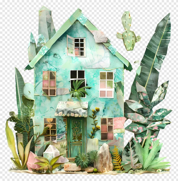 Tags: abstract architecture artistic collage botanical illustration crystals design element digital art dreamy home enchanted garden fantasy house free PNG gemstones lush greenery mint green nature pastel surreal art teal cottage transparent background tropical plants whimsical house