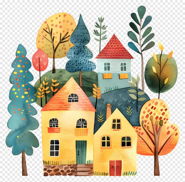 Download this enchanting, free PNG of a whimsical watercolor village, perfect for adding a touch of charm to your creative projects. This high-quality illustration features cozy, brightly colored houses with red and orange roofs, nestled amidst a vibrant array of autumn trees and lush green foliage on a picturesque hillside. With its unique hand-drawn aesthetic and transparent background, it's ideal for digital art, greeting cards, educational materials, website design, or any project needing a fairytale touch. Get your high-resolution, transparent PNG for free and bring a cheerful, fantastical mood to your designs!