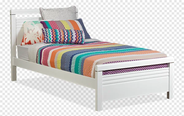 Download this high-resolution PNG image of a stylish white twin bed, perfect for design projects, presentations, or websites. The bed features a clean, modern design with a colorful bedding set for visual interest. Ideal for showcasing children's bedrooms, interior design catalogs, or furniture websites. Download now for free and enhance your creative projects!