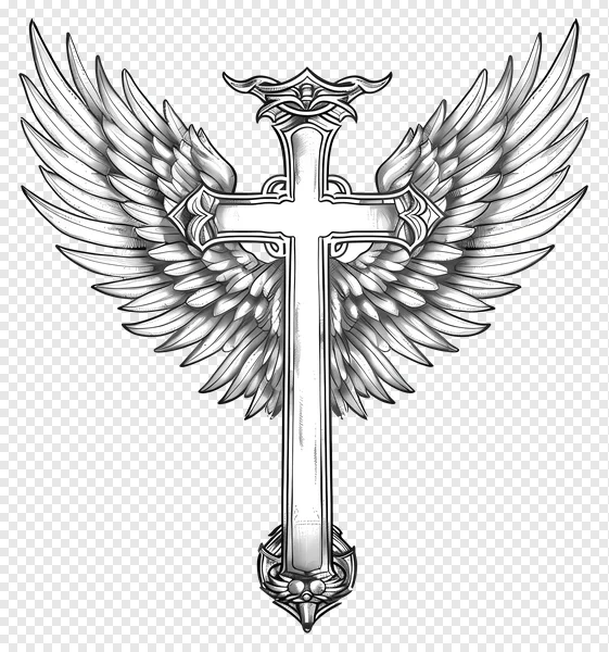 Tags: angel wings artwork black and white christianity cross sword divine emblem faith free png graphic design grayscale heraldry illustration png religious symbol spirituality sword tattoo design transparent background winged cross