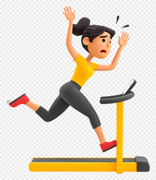 Download this free PNG image of a 3D cartoon woman hilariously losing her balance on a treadmill! Perfect for illustrating fitness fails, workout humor, safety warnings, or adding a playful touch to your health and wellness content. High-quality, transparent background for easy integration into your projects. Get it now and add some fun to your designs!