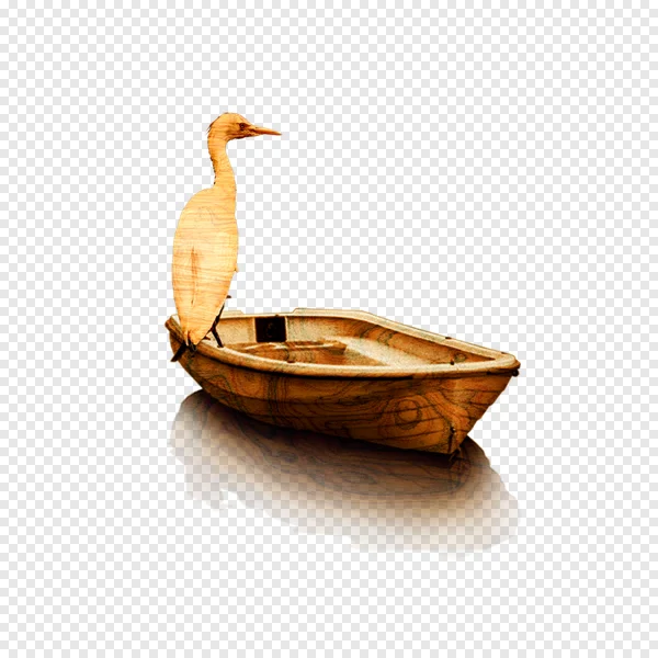 Discover this captivating free PNG image featuring a beautifully stylized wooden egret perched gracefully on a rustic wooden boat. The intricate wood grain texture on both the bird and the boat creates a unique, artistic aesthetic, complemented by a serene reflection on the water. Perfect for adding a touch of nature-inspired artistry to your digital projects, websites, presentations, or graphic designs. Download this high-quality, transparent PNG for instant integration into any creative endeavor. Ideal for themes related to wildlife, sailing, peace, and natural craftsmanship.