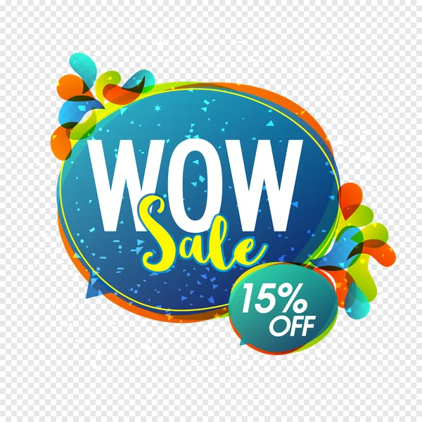 Get this eye-catching 'WOW Sale 15% OFF' PNG image for free! Featuring a vibrant, modern design with a dynamic blue speech bubble, abstract colorful background elements, and playful confetti, this high-quality graphic is perfect for announcing special discounts. Download this transparent background image to easily enhance your website banners, social media posts, advertising campaigns, e-commerce promotions, or any digital marketing material. Grab this striking promotional tag now and make your sales stand out with a 'Wow!' factor!