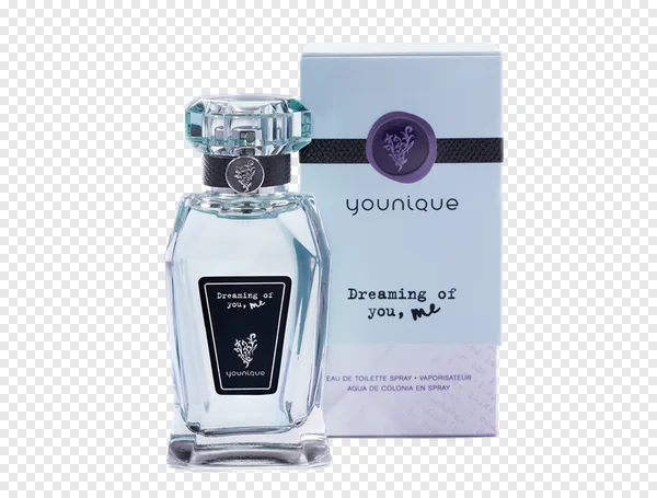 Download a high-quality, free PNG image of the Younique 'Dreaming of you, me' Eau de Toilette perfume bottle and its elegant packaging box. This crisp product shot features the beautiful fragrance bottle with its faceted cap, light blue liquid, and dark label, alongside the coordinating light blue box adorned with the Younique logo and a decorative purple wax seal. Perfect for beauty blogs, cosmetic reviews, graphic design projects, marketing materials, or personal use. Get this transparent background perfume image instantly for your next creative endeavor!