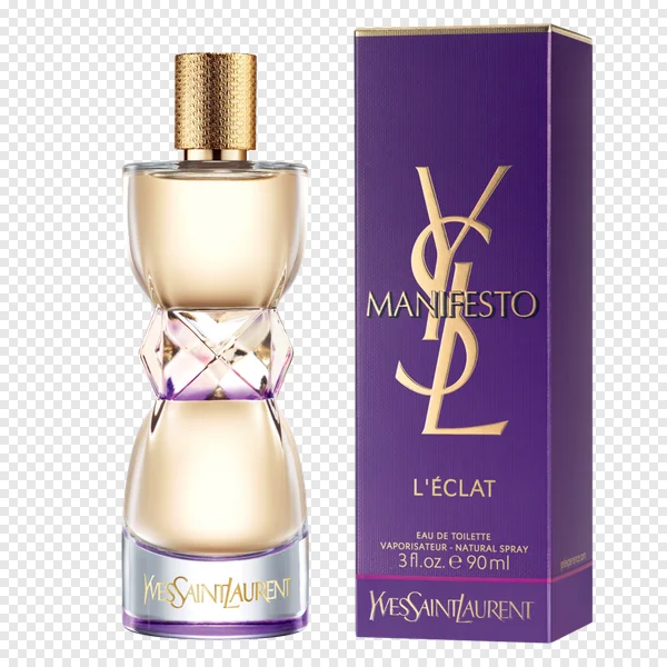 Download a high-quality, transparent PNG image of the Yves Saint Laurent Manifesto L'Éclat Eau de Toilette perfume bottle and packaging. Perfect for graphic design projects, website visuals, social media content, or presentations. This free PNG features the iconic YSL bottle design and vibrant purple box. Enhance your beauty and fashion-related designs with this stunning, royalty-free image! Get your free download now!