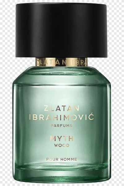 Download a high-quality, transparent PNG of the Zlatan Ibrahimovic Myth Wood Pour Homme perfume bottle for free. This elegant men's fragrance bottle features a stylish green glass design with a sleek black cap and distinctive gold lettering. Perfect for graphic designers, e-commerce sites, product mockups, marketing materials, or personal projects. Get this iconic woody scent bottle cut out on a transparent background, ready to integrate into your creative designs and elevate your visuals. Experience luxury product photography without the cost!